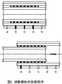 3. 在交叉導(dǎo)軌端部安裝擋塊,并移動(dòng)工作臺(tái),通過(guò)校正保持架的位置確保得到所要求的行程長(zhǎng)度。如圖2所示,將滾柱保持器將滾柱保持器放置在軌道的中央部分, 用扭矩扳手均等地?cái)Q緊在有滾柱范圍內(nèi)的調(diào)整螺栓(b、c和d),直到千分表指到所定的變位量為止。然后全鎖緊已調(diào)整部位的裝配螺栓。