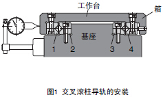 1.使用THK交叉滾柱導(dǎo)軌的間隙來(lái)調(diào)整螺栓,將軌道2和3緊貼放置在基座安裝面上,軌道1緊貼放置在工作臺(tái)安裝面上, 將軌道裝配螺栓牢固地?cái)Q緊。將軌道4暫時(shí)固定在工作臺(tái)上,使其不在移動(dòng)。在設(shè)計(jì)時(shí)要注意,讓軌道的裝配螺栓在安裝狀態(tài)下也可以進(jìn)行全鎖緊作業(yè)。