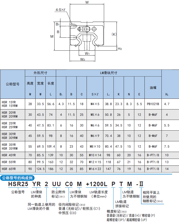 注) 標(biāo)記M表示LM滑塊、LM軌道和鋼球采用不銹鋼材料。因此帶此標(biāo)記的型號(hào)耐腐蝕性強(qiáng),不易受環(huán)境影響。