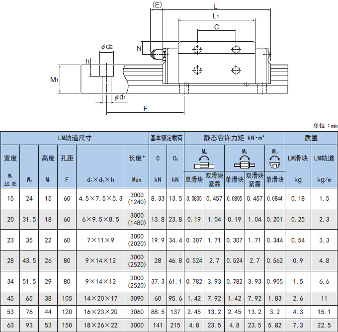 靜態(tài)容許力矩* 單滑塊∶使用1個(gè)LM滑塊的靜態(tài)容許力矩值