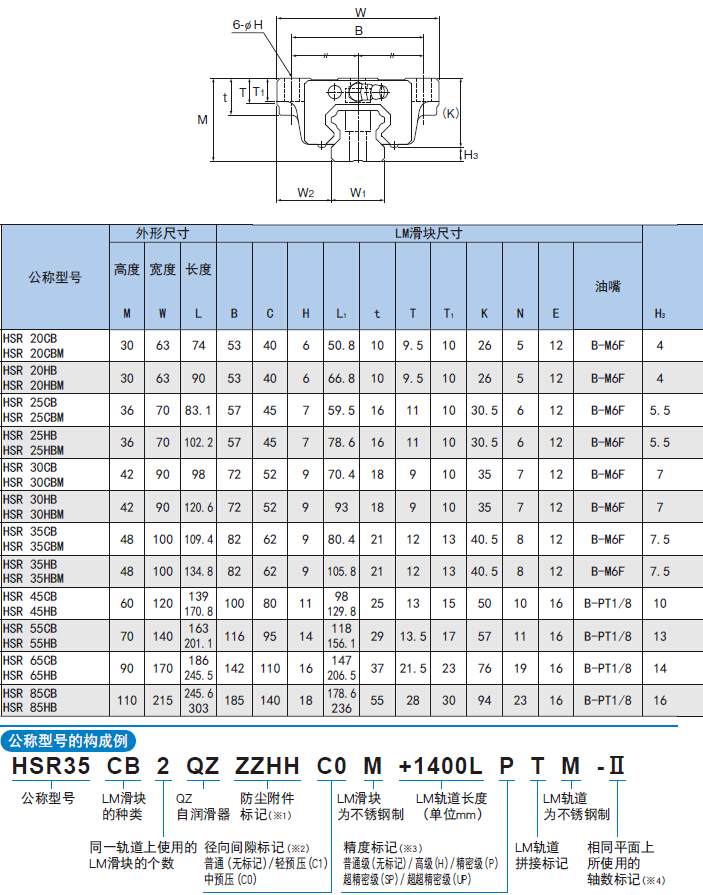 注) 標記M表示LM滑塊、LM軌道和鋼球采用不銹鋼材料。因此帶此標記的型號耐腐蝕性強,不易受環(huán)境影響。
