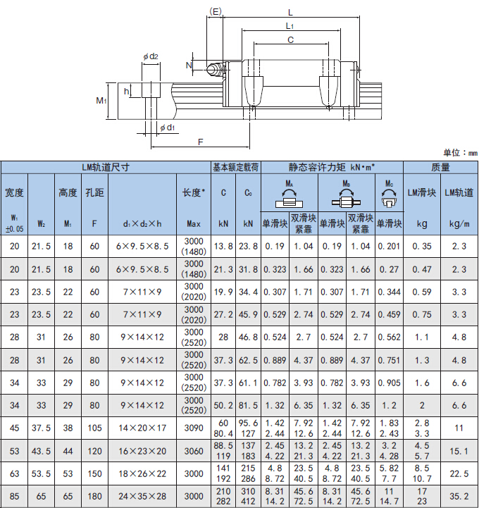 靜態(tài)容許力矩* 單滑塊∶使用1個LM滑塊的靜態(tài)容許力矩值