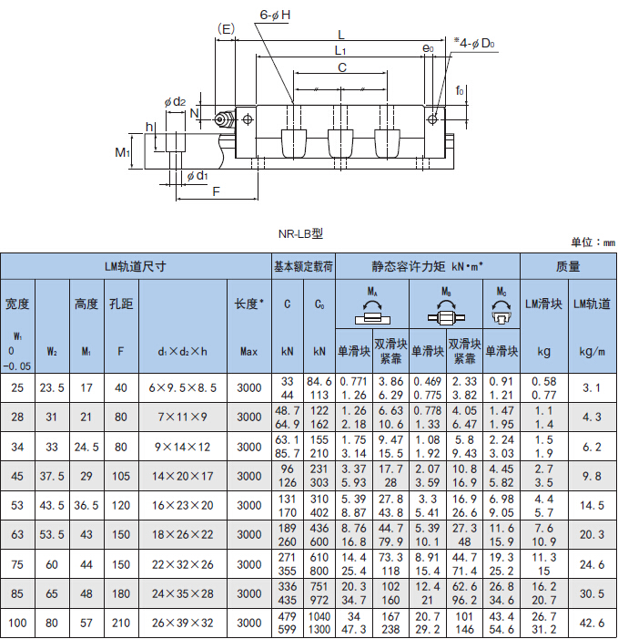 靜態(tài)容許力矩* 單滑塊∶使用1個(gè)LM滑塊的靜態(tài)容許力矩值