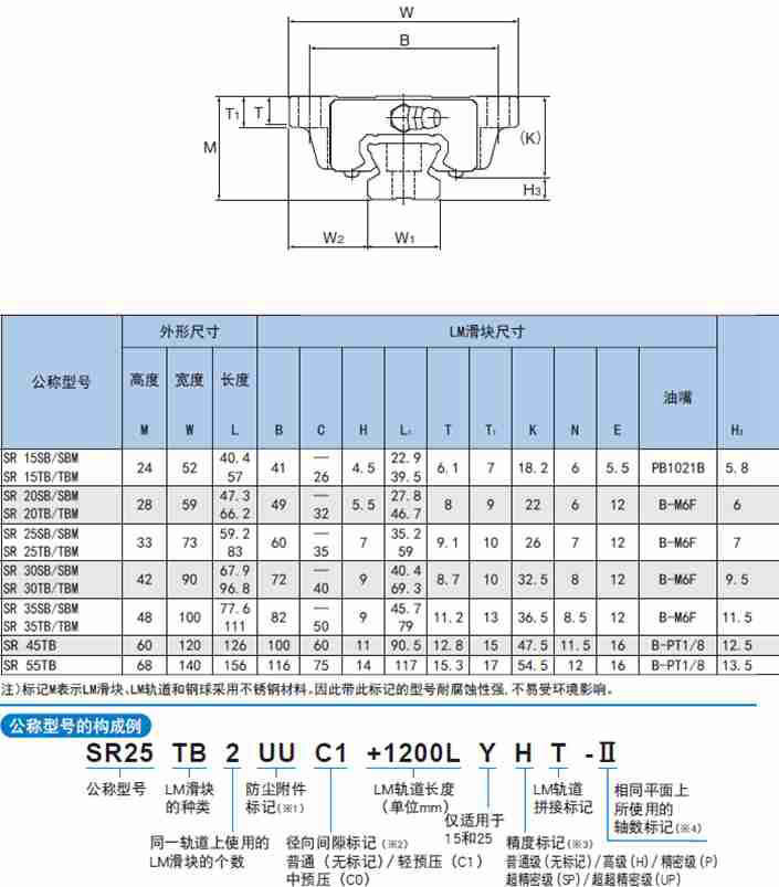 注) 標(biāo)記M表示LM滑塊、LM軌道和鋼球采用不銹鋼材料。因此帶此標(biāo)記的型號耐腐蝕性強(qiáng),不易受環(huán)境影響。