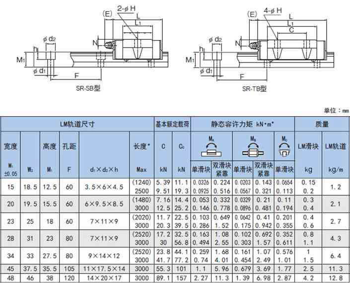 SR-TB型的LM滑塊可以從下方按裝,SR-SB型縮短了滑塊全長,是節(jié)省空間型