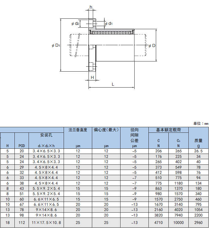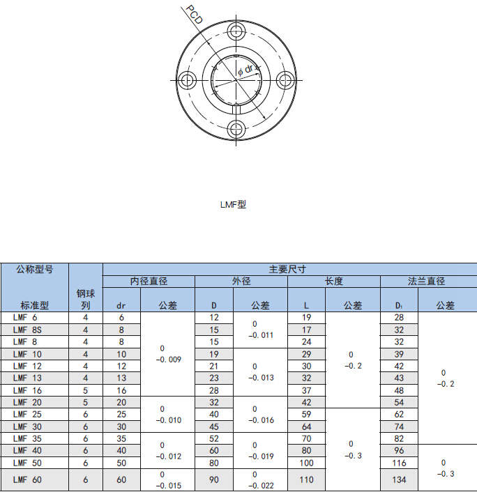 LMF型是由標(biāo)準(zhǔn)型的直線軸承軸承套與法蘭為 一體化結(jié)構(gòu),可以用螺栓直接把軸承固定在支 撐座上,因此安裝十分容易 |