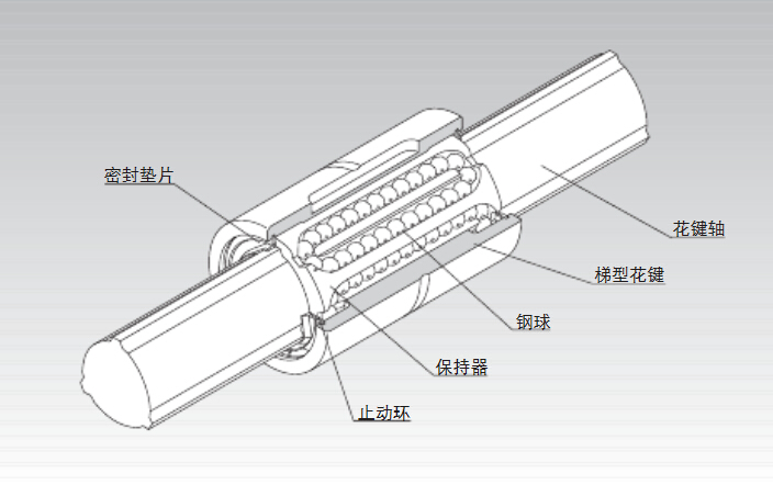 高扭矩型滾針花鍵,是在花鍵軸外圈上排列了3條滾動(dòng)面,然后配有2列負(fù)荷鋼球列分別從左右方將其夾住?;ㄦI軸是經(jīng)過精密研磨加工的.當(dāng)花鍵軸承受扭矩時(shí),在6列負(fù)荷鋼球中與扭矩方向一致的3列鋼球均等地承受負(fù)荷,并且自動(dòng)地決定旋轉(zhuǎn)中心。反轉(zhuǎn)時(shí),就由反方向的3列鋼球也不會(huì)脫落。