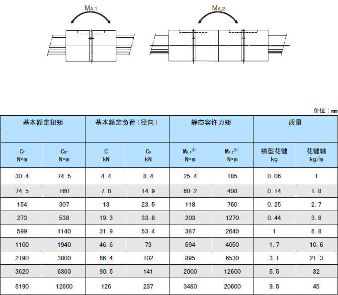 如上表所示,MA.2為2個(gè)梯型花鍵緊靠使用時(shí)的軸向容許力矩值。