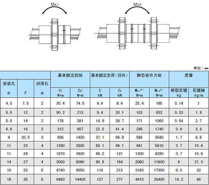 如上表所示,MA.2為2個(gè)梯型花鍵緊靠使用時(shí)的軸向容許力矩值。