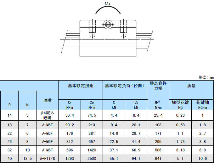 注)如上表所示,MA為使用1個梯型花鍵時的軸向容許力矩值。 有關(guān)滾珠花鍵軸按精度分類的最大長度的詳細(xì)情況,請咨詢啟威五金公司