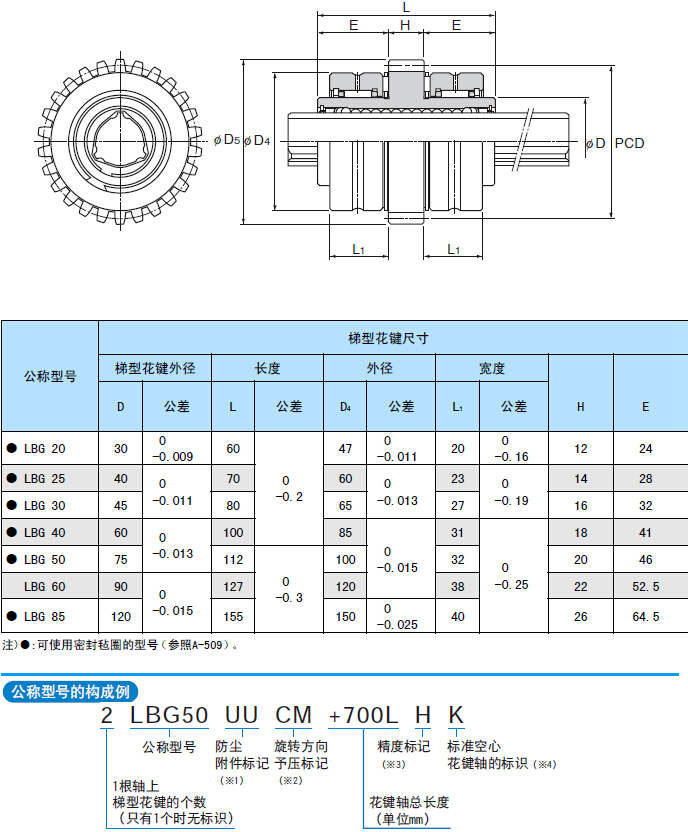 LBG型是在法蘭外圈上進(jìn)行了齒輪加工,并將徑向和推力軸承緊湊的排列在花鍵母上,因此最適合于花鍵母驅(qū)動(dòng)的扭矩傳遞機(jī)構(gòu)