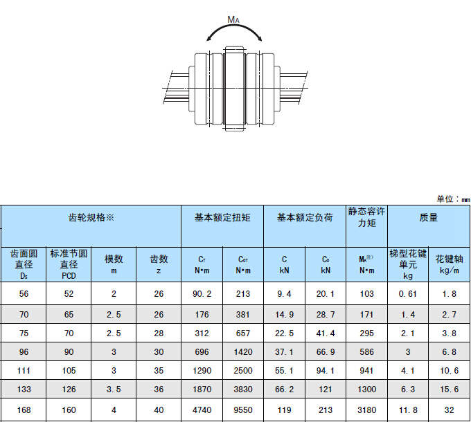 如上表所示,MA為使用1個(gè)梯型花鍵時(shí)的軸向容許力矩值。