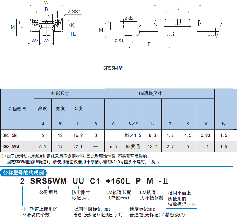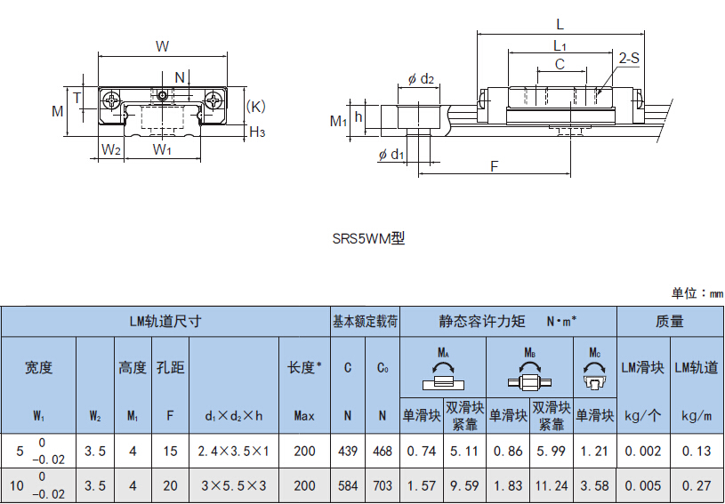 SRS5M/WM型加長(zhǎng)了LM滑塊的全長(zhǎng),增加了寬度以及提高了額定載荷和容許力矩。具有安裝尺寸互換性