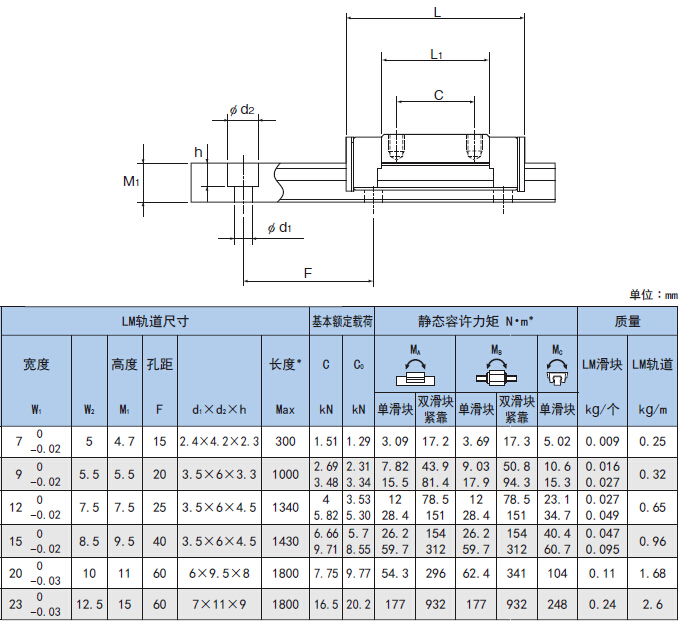 滑塊∶使用1個(gè)LM滑塊的靜態(tài)容許力矩值