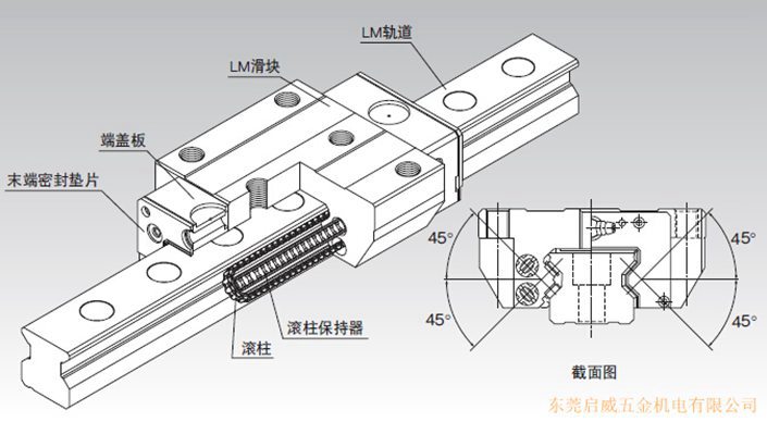 為使LM滑塊上的4個(gè)作用方向(徑向、反徑向和側(cè)向)均具有相同的額定載荷,各滾柱列被設(shè)計(jì)成為接觸角45度配置,因此所有方向都具有高剛性。