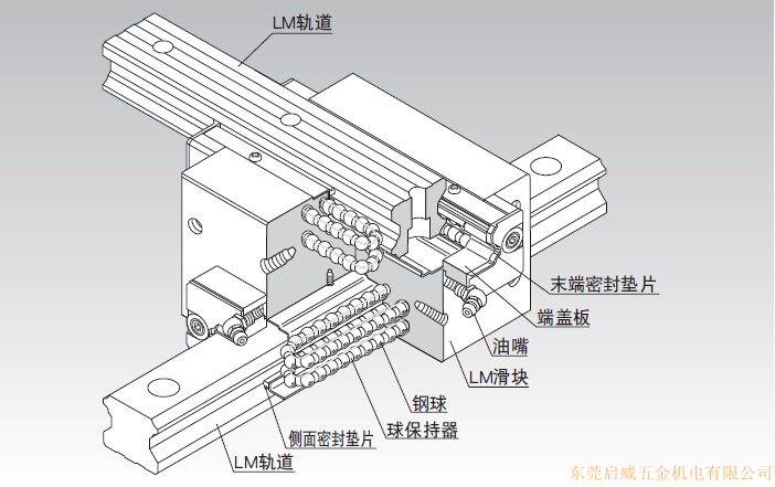 THK直線導(dǎo)軌SCR型的LM 軌道和LM滑塊上經(jīng)過精密加工而形成的4列滾動面進(jìn)行平穩(wěn)的滑動;保持器與組裝在LM滑塊上的端蓋板,使鋼球列作循環(huán)運動。
