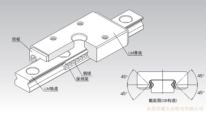 為使LM滑塊上的4個作用方向(徑向、反徑向和側(cè)向)均具有相同的額定載荷,各鋼球列被設(shè)計成按接觸角45度配置,因此無論在任何安裝姿勢下都可以使用,使用范圍廣泛。