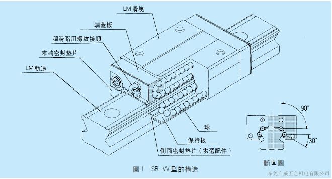 鋼球沿著SR型軌道和SR型滑塊上經(jīng)過(guò)精密研磨加工的4列滾動(dòng)面進(jìn)行滾動(dòng);通過(guò)組裝在LM滑塊上的端蓋板,使鋼球列做循環(huán)運(yùn)動(dòng)。LM滑塊采用保持板將鋼球保持住,因此即使從LM軌道中抽出LM滑塊,鋼球也不會(huì)脫落。同時(shí),因斷面高度低,并且對(duì)LM滑塊進(jìn)行了高剛性設(shè)計(jì),從而能獲得穩(wěn)定的高精度直線(xiàn)運(yùn)動(dòng)。