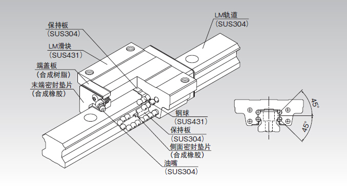 LM滑塊、LM軌道和鋼球采用的是高耐蝕性的不銹鋼,其它金屬零部件也是由不銹鋼制,實(shí)現(xiàn)了超強(qiáng)的抗耐腐蝕性。因此不需要表面處理。