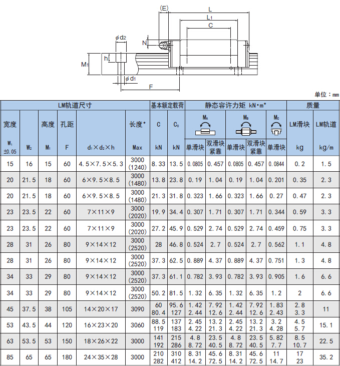 靜態(tài)容許力矩* 單滑塊∶使用1個LM滑塊的靜態(tài)容許力矩值