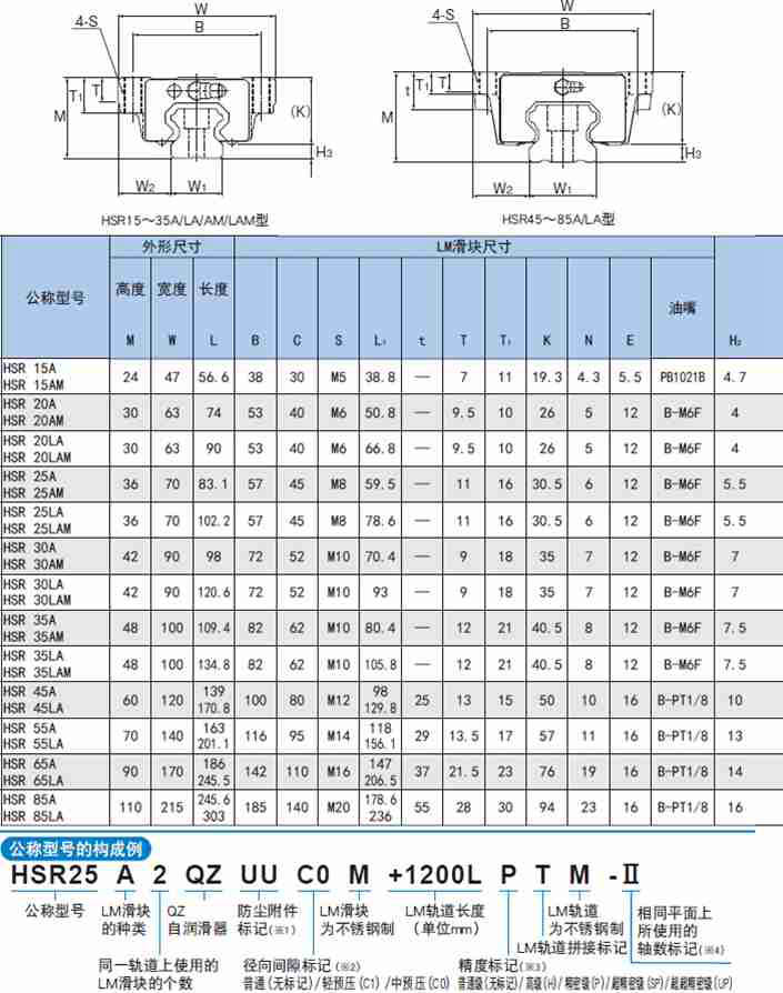 注) 標(biāo)記M表示LM滑塊、LM軌道和鋼球采用不銹鋼材料。因此帶此標(biāo)記的型號耐腐蝕性強(qiáng),不易受環(huán)境影響。
